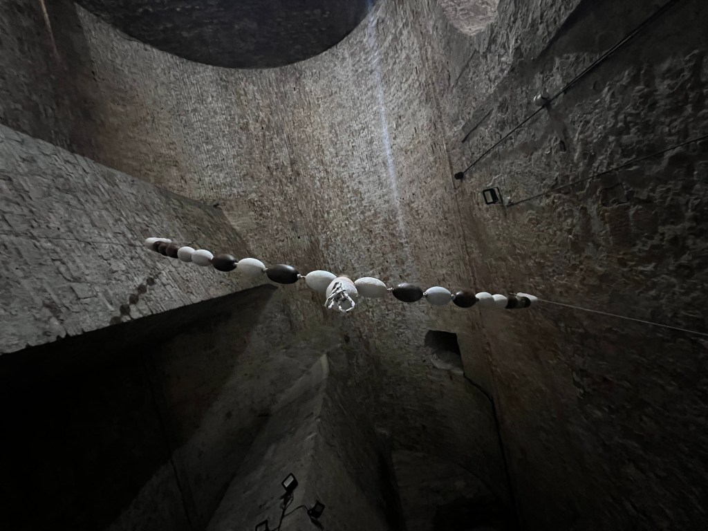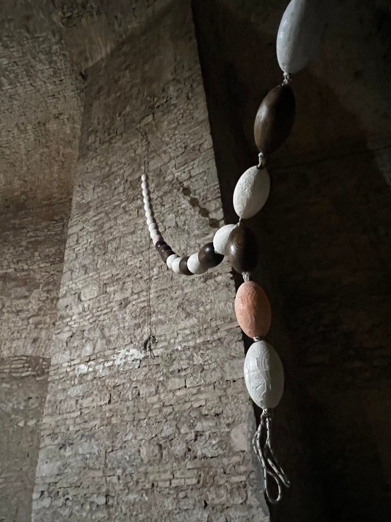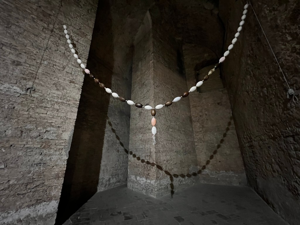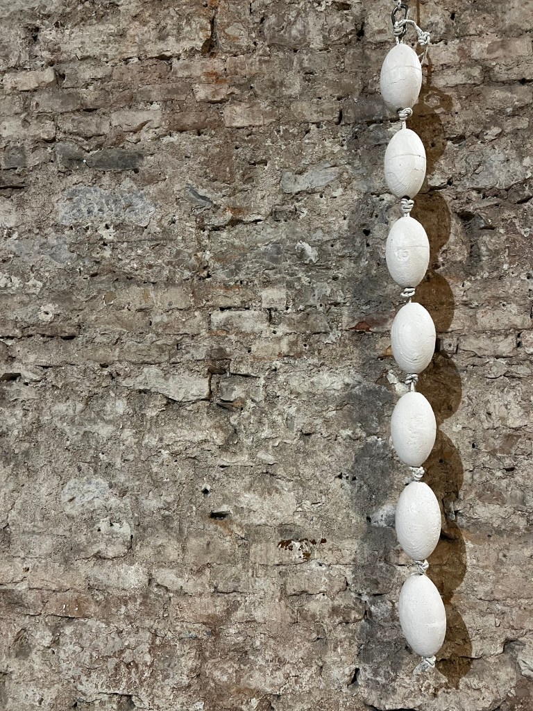 11 galleggianti in legno e 16 calchi in gesso su corda – ogni ‘perlina’ 16 x 8 cm. dimensioni 240 cm x 300