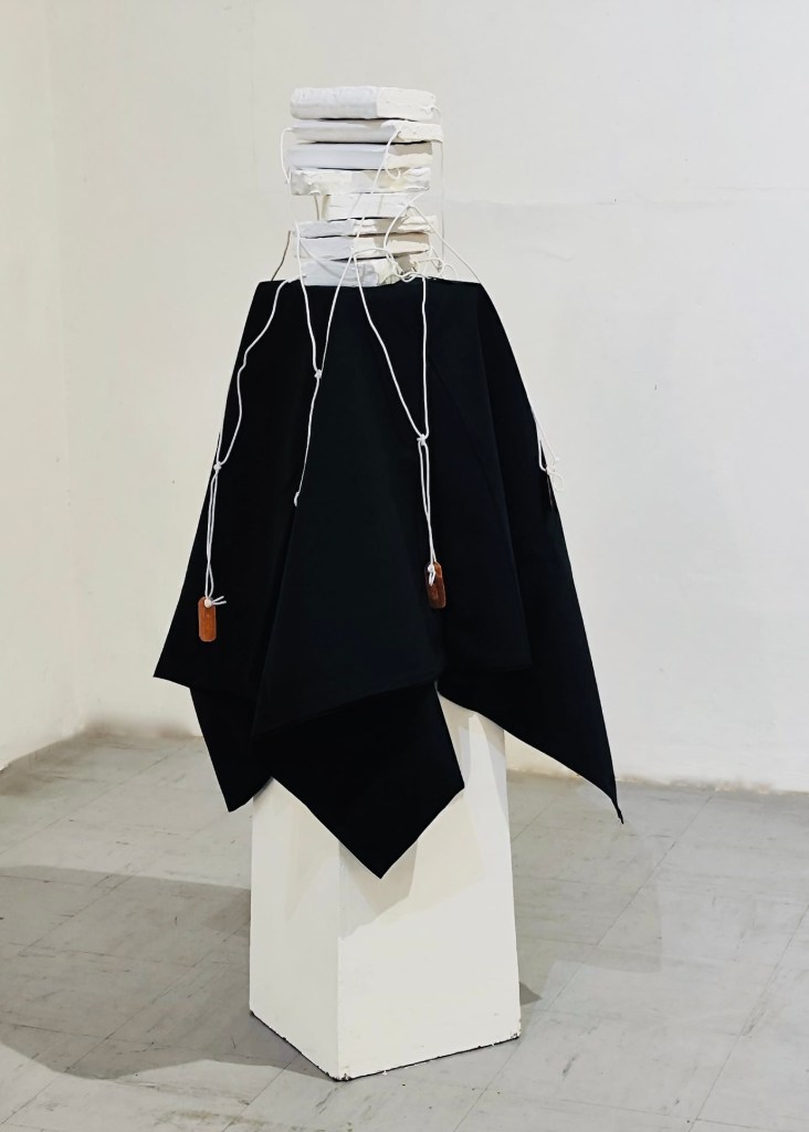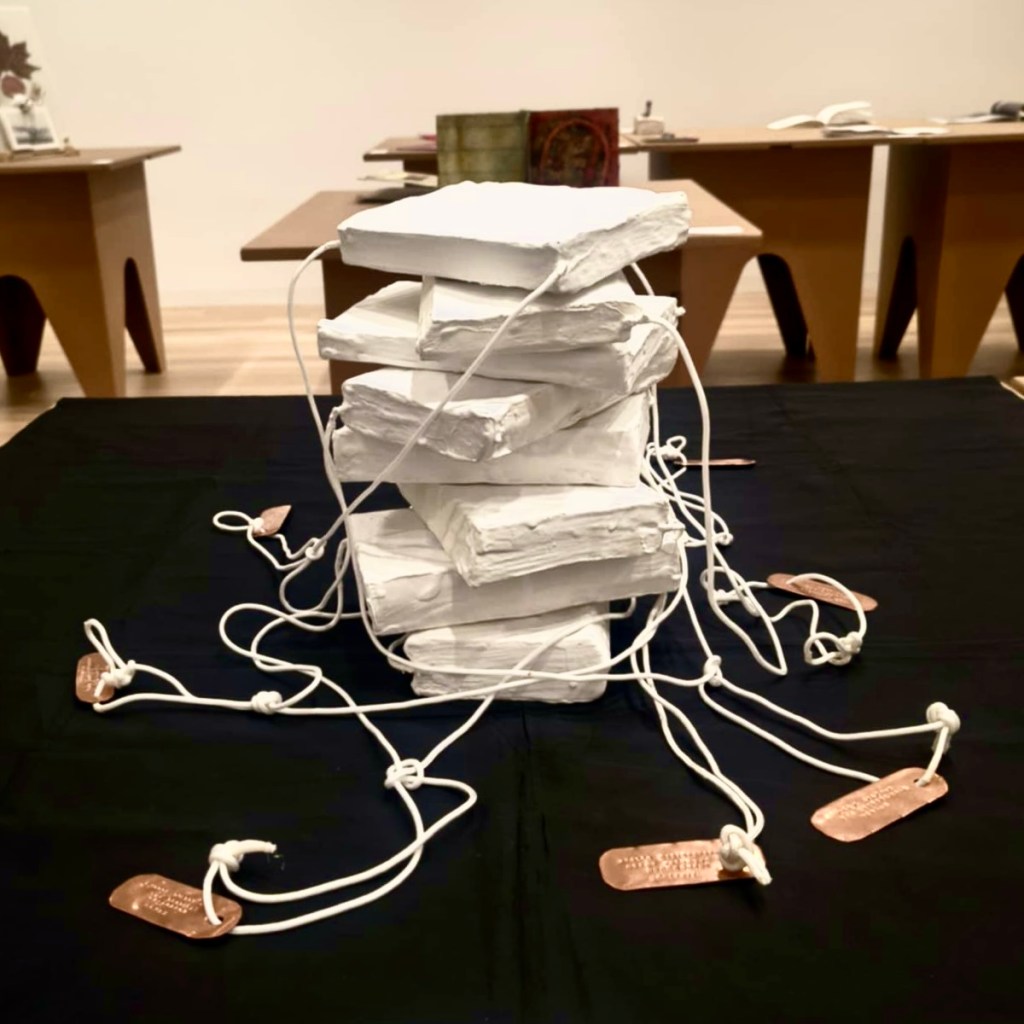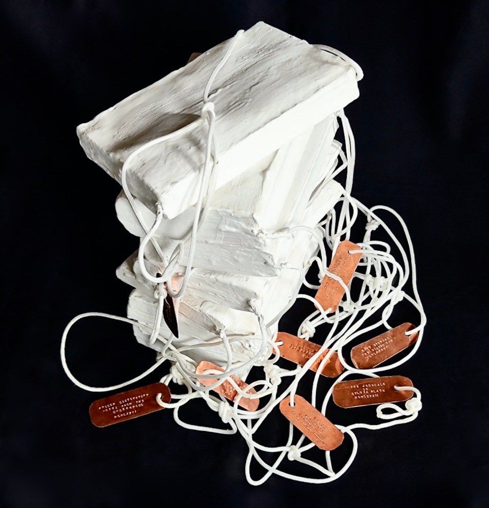 Our work consists of eight paperbacks that have been coated in plaster and stacked; it represents a personal experience that has shaped part of our artistic thought. Each book is enveloped in white plaster resin, it has become pure and wordless – the thoughts have been consumed. They are anchored to a white rope with a copper label, displaying the title, author, and year of publication.