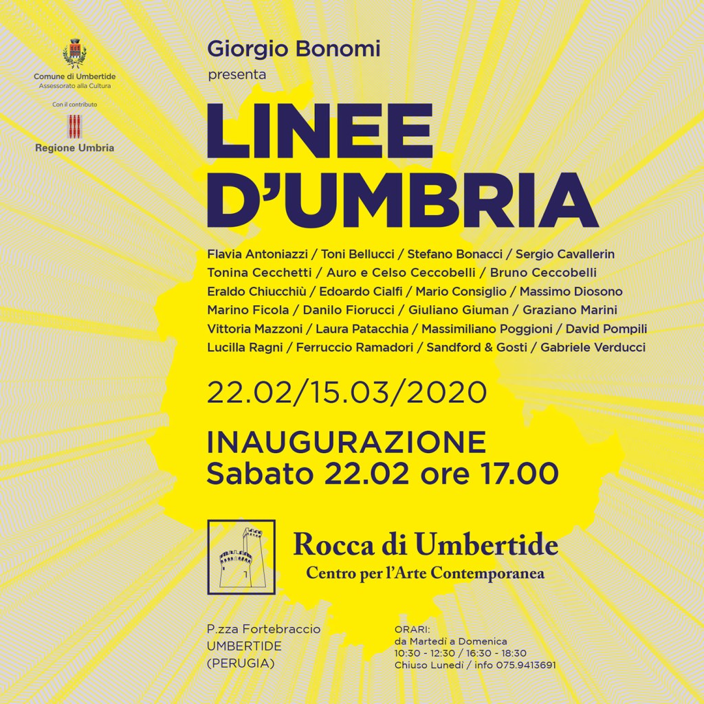 Sabato 22 febbraio alle ore 17:00, presso la Rocca-Centro per l’arte contemporanea di Umbertide, si terrà l’inaugurazione di “Linee d’ Umbria”, la mostra curata da Giorgio Bonomi che vedrà la presenza di 25 artisti umbri. Al taglio del nastro prenderanno parte il sindaco Luca Carizia, l’assessore comunale alla Cultura, Sara Pierucci, il curatore dell’esposizione e gli artisti coinvolti.La mostra “Linee d’Umbria”, organizzata dall’Assessorato alla Cultura del Comune di Umbertide con il contributo della Regione Umbria, potrà essere visitata fino al 15 marzo.L’esposizione riprende il titolo di un’altra esposizione curata dallo stesso Bonomi nel 1987 presso il Palazzo dell’Unesco a Parigi.Nel percorso espositivo è presente una selezione abbastanza ampia di artisti “umbri”, per nascita o per residenza.